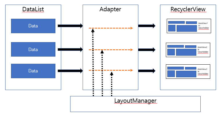 ◼️ LayoutManager : 리사이클러뷰에게 뷰를 어떻게 보여줄지 말해준다.