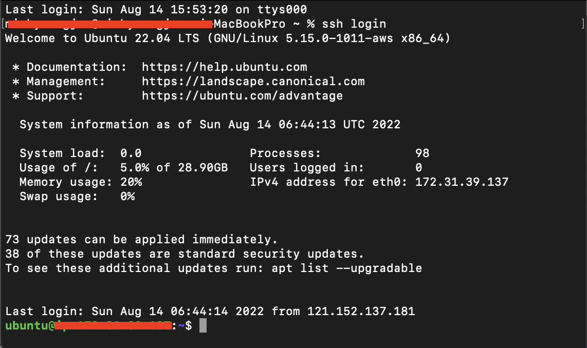 [ex] ssh online ] 을 입력하면 서버에 성공적으로 접속한다.