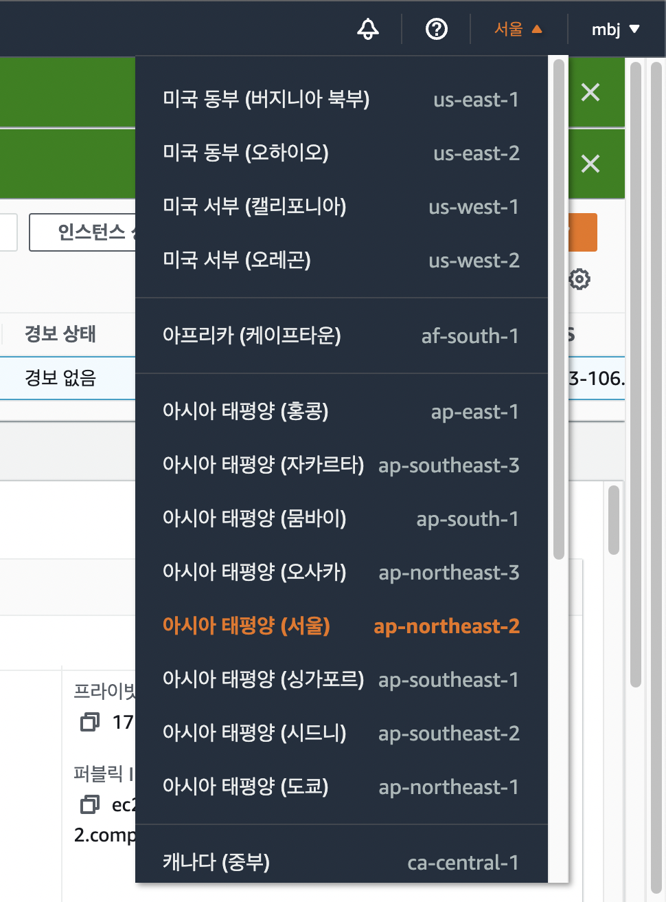 2. 우측 상단에 있는 리전(AWS의 서비스가 구동될 지역)을 서울 리전으로 선택한다.