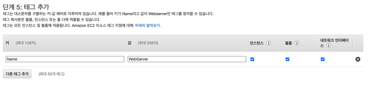 [ 웹 콘솔에서 표기될 태그인 Name 태그를 등록하고, 태그는 해당 인스턴스를 표현하는 여러 이름으로 사용될 수 있다. 즉, EC2의 이름을 붙인다고 생각하면 된다. [ex] 인스타그래, 페이스북 등의 sis 태그와 동일한 역할 ]