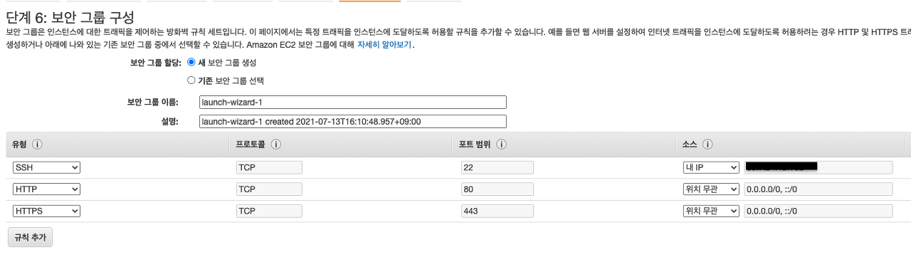 [ 보안을 위해 SSH유형은 내 IP로만 접근 가능하게 하며(만약 본인의 IP 및 다른 프로젝트 인원의 IP 설정이 필요하다면, 해당 장소의 IP를 다시 SSH 규칙에 추가한다.), 프로젝트 기본 포트는 8080추가, HTTPS는 443 포트를 추가하고 검토 및 시작 버튼을 클릭한다. 만약 인스턴스를 보안을 개선하라는 경고 메세지가 나온다면 이것은 8080이 전체 오픈되어서 발생하는 메세지로 8080을 열어놓는 것은 위험한 일이 아니므로 그냥 무시해도 된다. ]