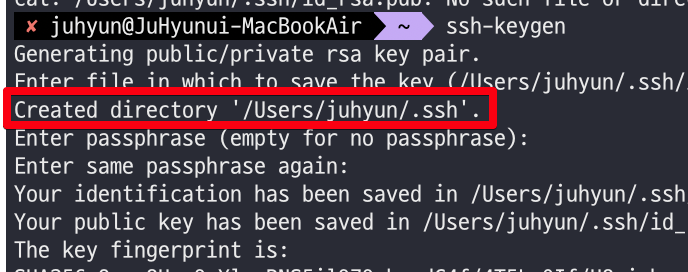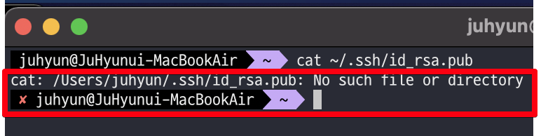 [ 터미널에 cat ~/.ssh/id_rsa.pub 입력하기 만약 생성한 적이 없으면 NO such file or directory 라고 뜬다. ]