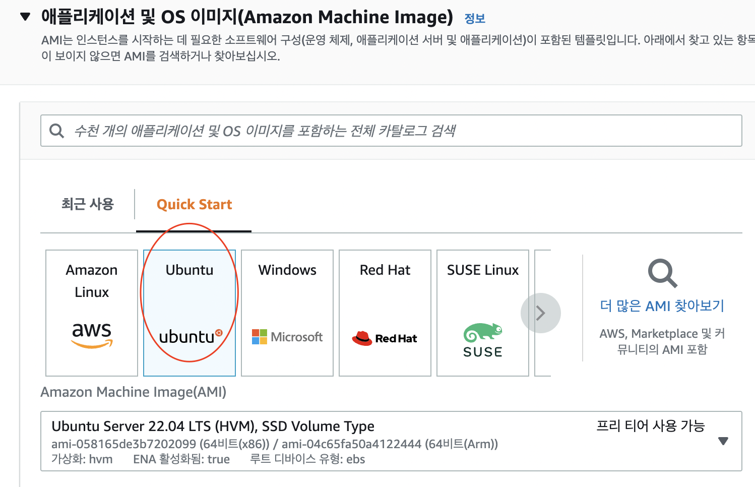 [ AMI란 EC2 인스턴스를 시작하는데 필요한 정보를 이미지로 만들어 둔 것, 인스턴스라는 가상머신에 운영체제 등을 설치할 수 있게 구워 넣은 이미지 , Macos가 새로 출시되었지만, 나는 가장 호환이 잘되는 Ubuntu를 선택했음.]
