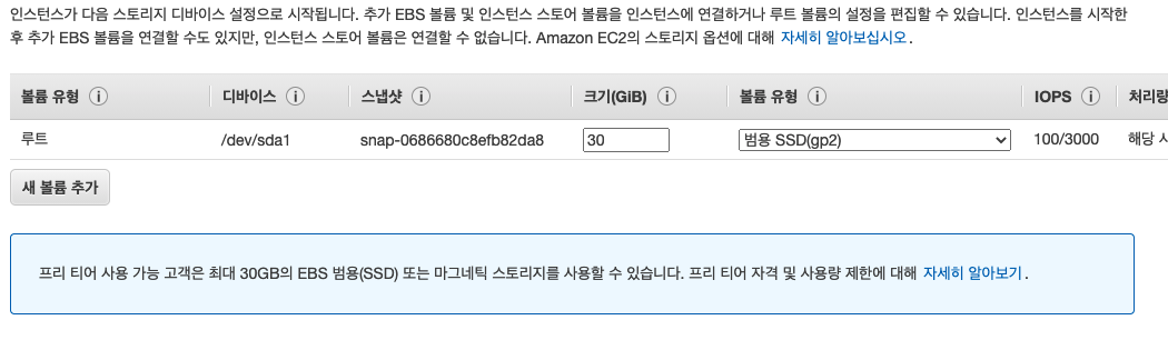 5. 스토리지 추가 - 크기(8G)를 프리티어 최고 용량인 30G로 바꿔준다.