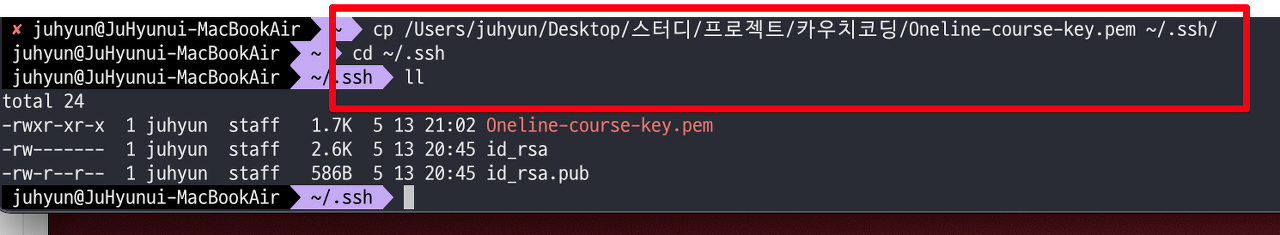 터미널에 cp pem키의 경로/pem키의 파일명 ~/.ssh/ 로 복사한다. 복사 후에 cd ~/.ssh로 이동 후 정상적으로 복사 되었는지 확인한다. ]
