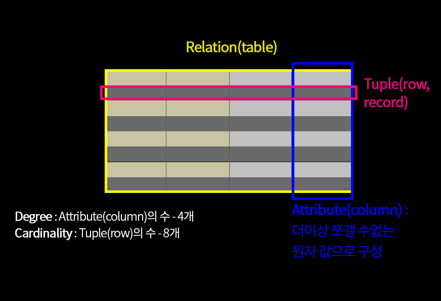 - 속성(attribute) : 하나의 릴레이션은 현실세계의 어떤 개체(entity)를 표현하고 저장되는 데 사용된다. 이때 개체는 사물이 될 수도, 추상적인 개념이 될 수도 있다.