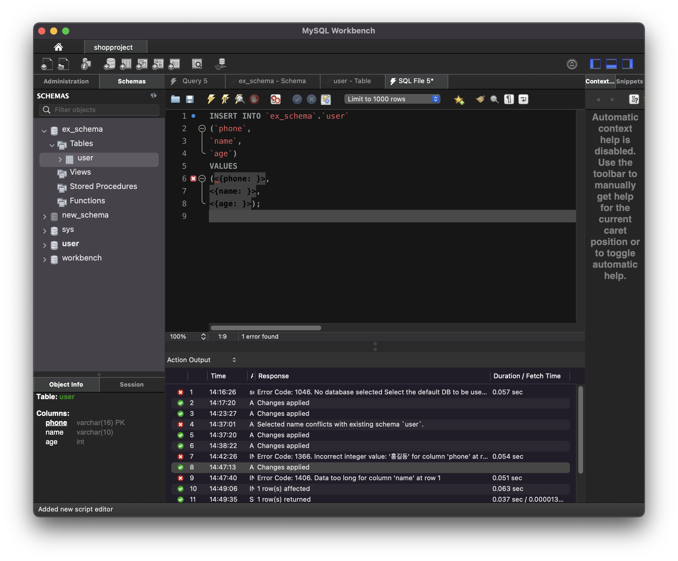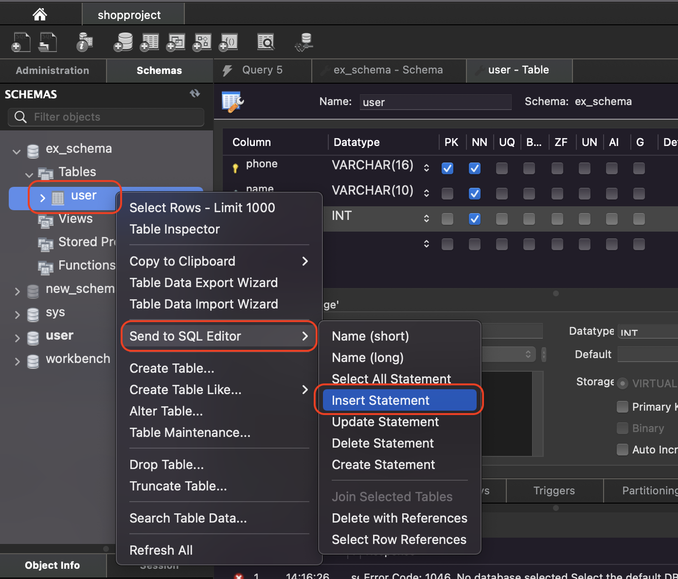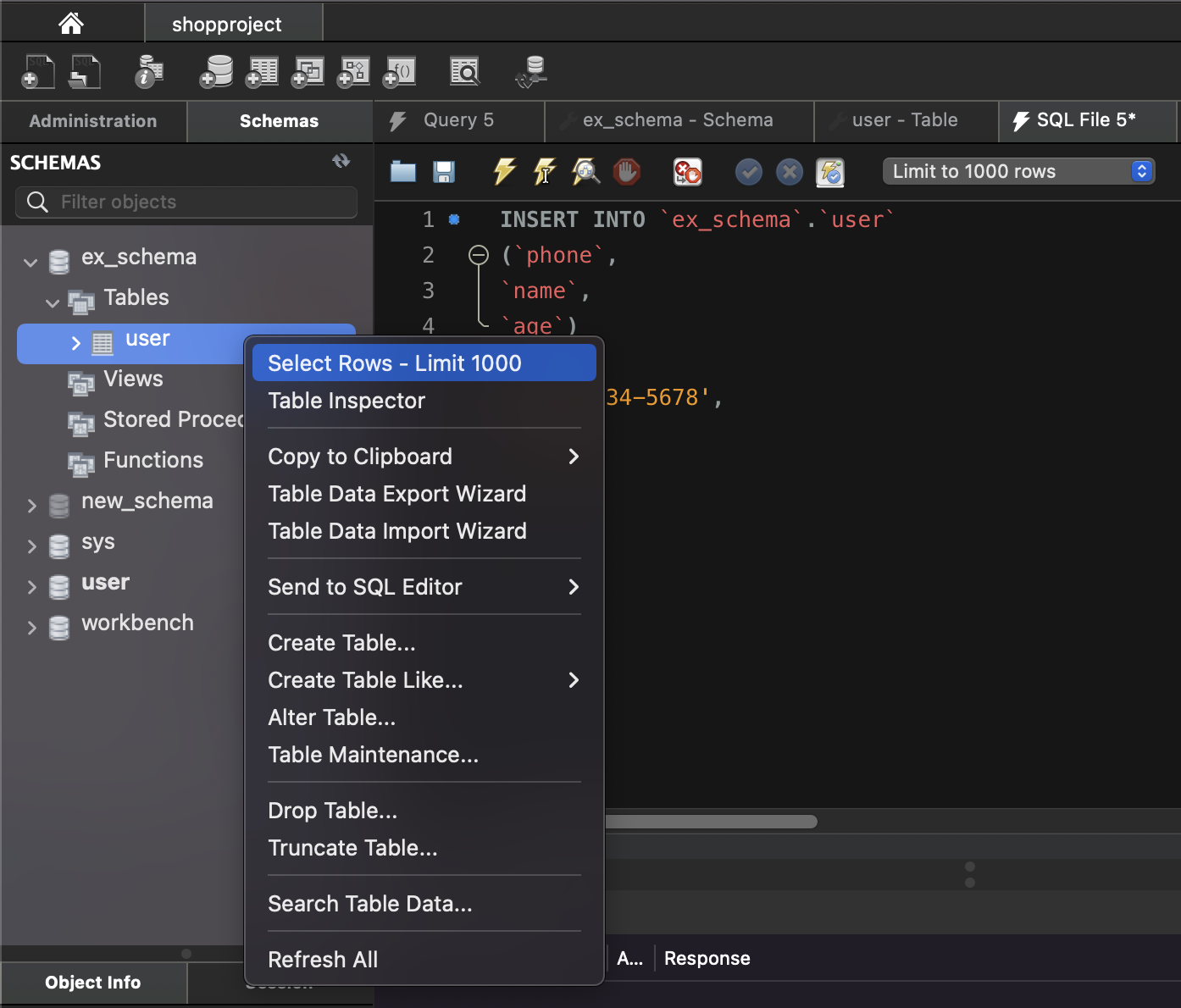 [ 'user'테이블 선택 후 마우스 오른쪽 > Send to SQL Editor > Insert Satement 선택 ]