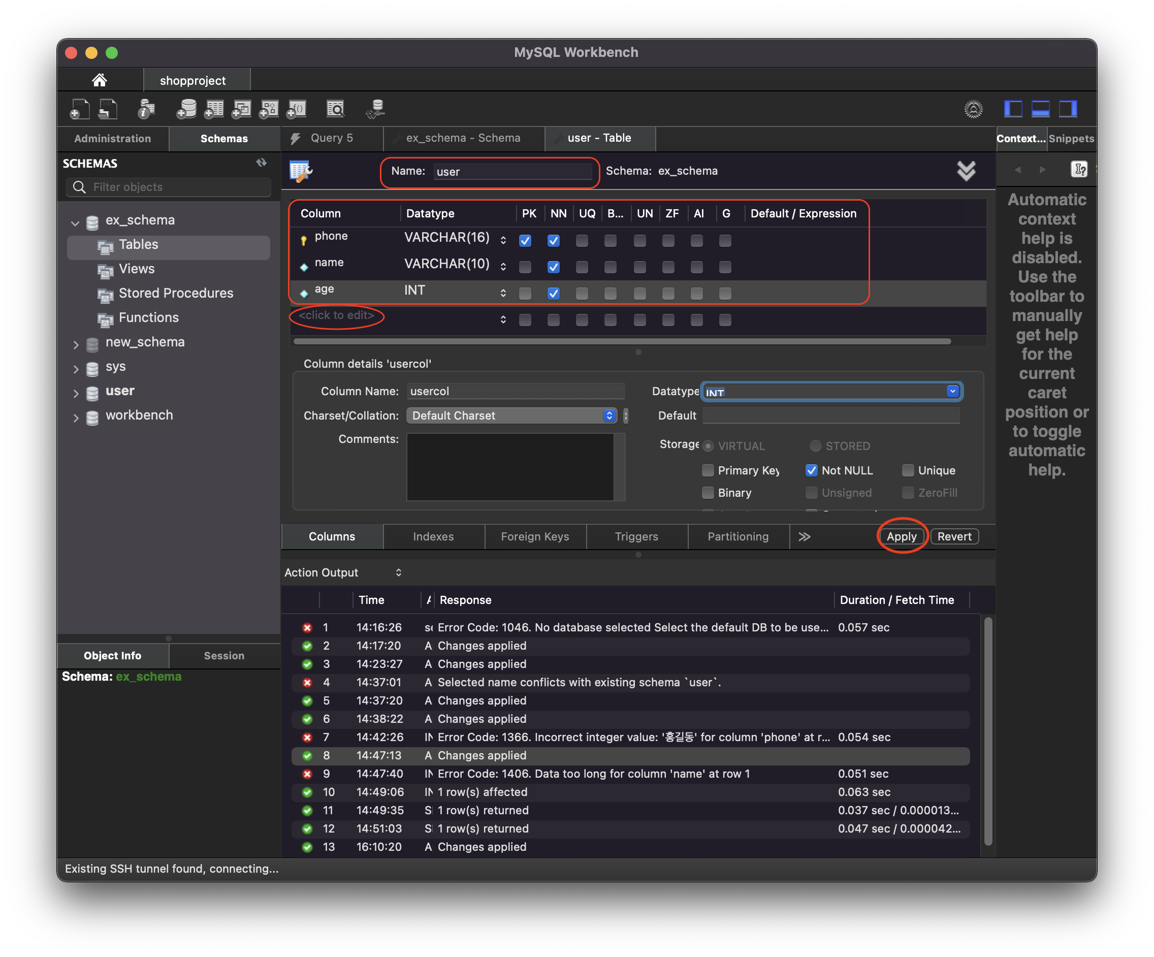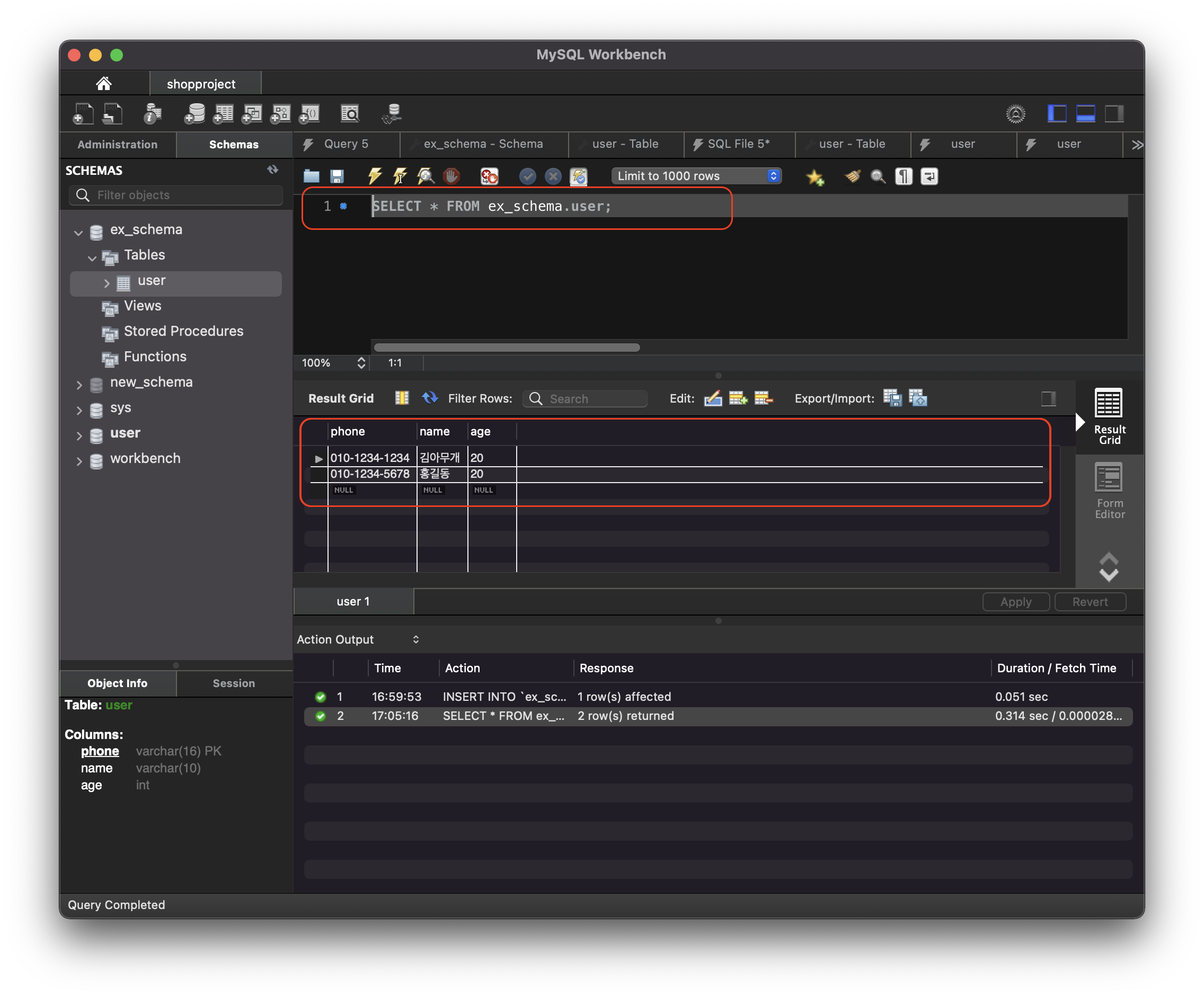 phone을 기본키로 설정한 이유는 phone 번호는 한 아이디 당 중복없고 null 값이 되어서는 안되는 값이기 때문에 기본키('PK'), 'NN'로 설정하였고 name과 age는 중복 가능한 값이고, null 값은 있으면 안되서 'NN' 만 클릭하였다.
