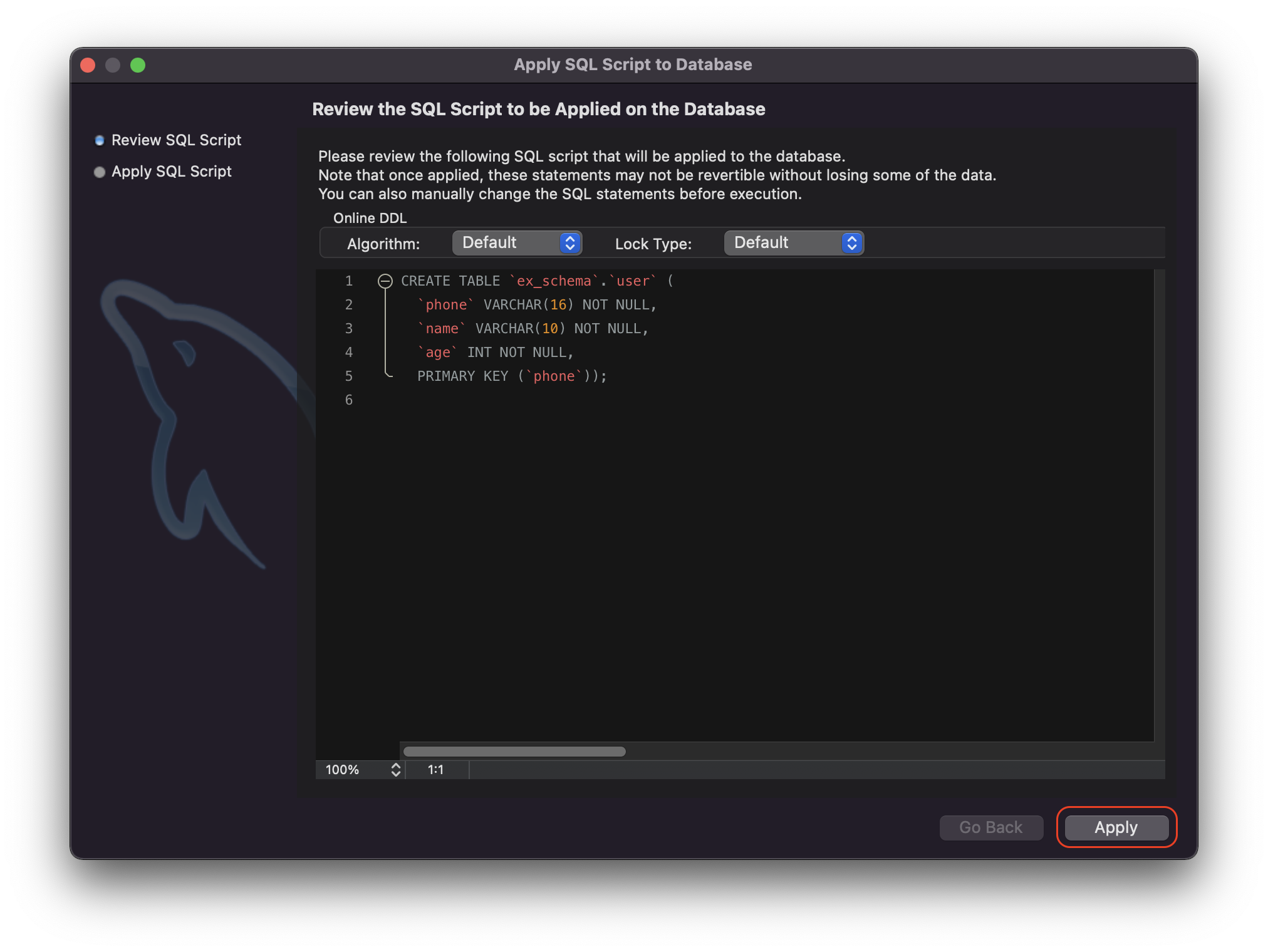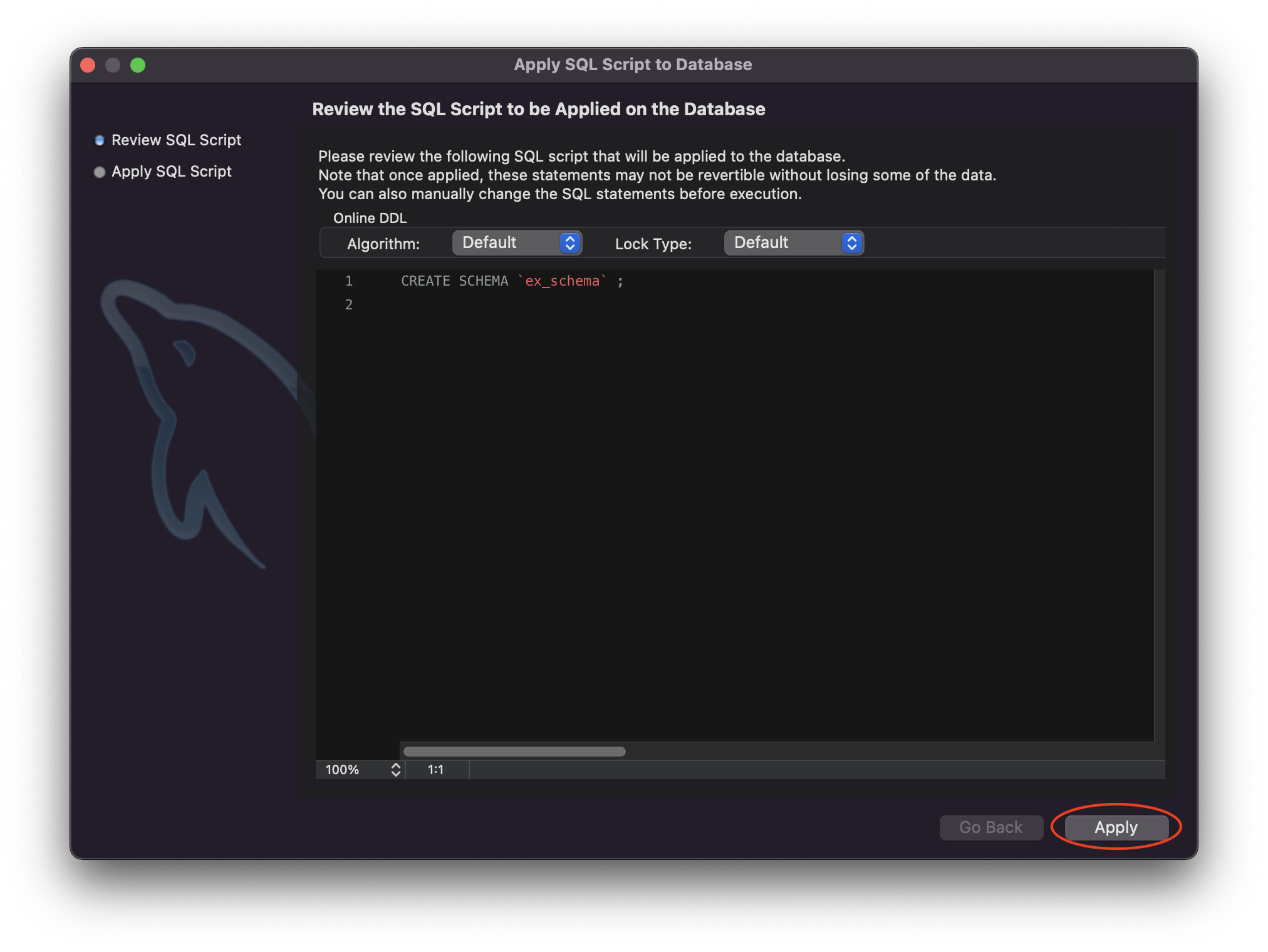 [ Name 부분에 생성할 스키마 이름을 입력 후 Apply 버튼을 눌러 스키마를 생성한다. 하지만 Apply 버튼을 누르면 바로 스키마가 생성되는 것이 아니라 다른 창이 한 번 더 출력되고, 여기선 제대로 설정했는지 확인하는 창이고 자신이 생성하려고 하는 설정이 맞는지 다시 하 번 확인하고 Apply 버튼을 눌러서 스키마를 생성한다. ]
