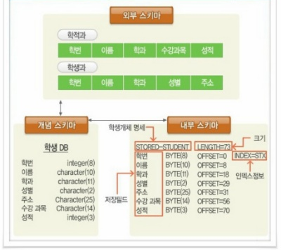 ==>> 따라서 개념스키마를 '스키마'라고 말하기도 하며, DB전체를 기술한 것이기 때문에 한 개 만 존재 가능하다.