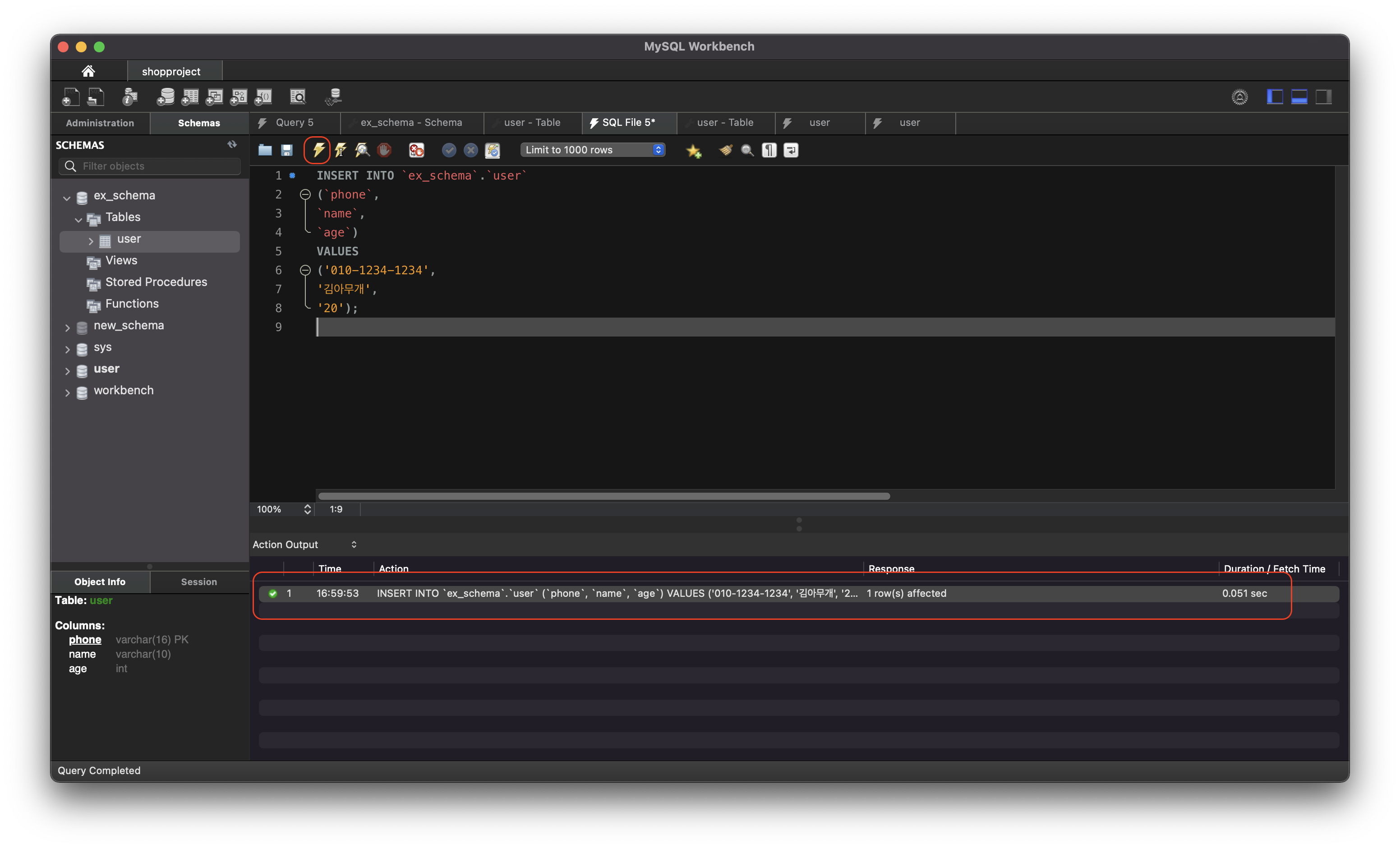 위에서 생성한 'user' 테이블에 SQL 구문을 사용하여 데이터를 추가하기