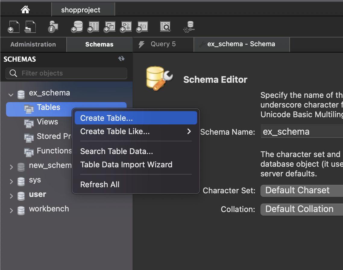 ex_schema' 스키마에 새로운 테이블을 추가하기 위해선 'Tables' 항목을 마우스 우클릭 - Create Table... 항목을 선택한다.