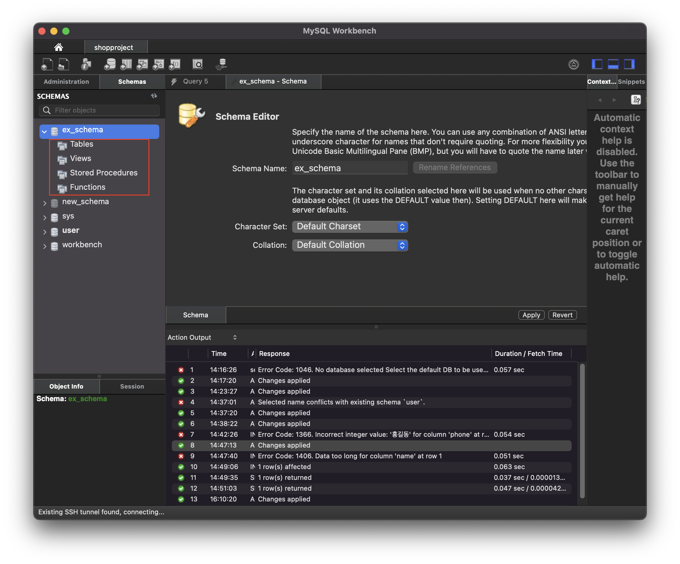 새로 추가된 'ex_schema' 스키마의 세부 항목에 'Tables', 'Views', 'Stored Proedures', 'Functions'이 있다. 여기선 'Tables'에 해당하는 개념과 사용방법에 대해서만 설명하겠다.