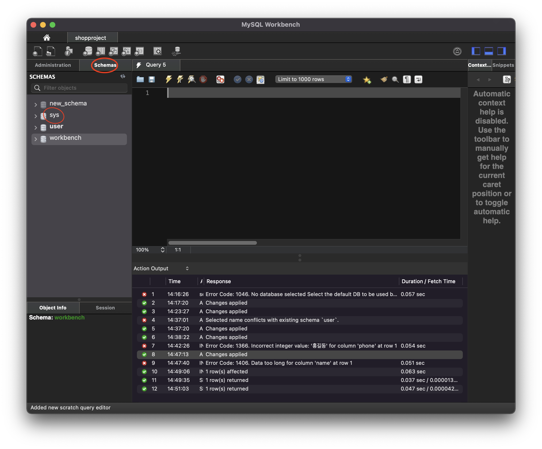 1. 정상적으로 Workbench에 들어가서 Schemas를 클릭하게 되면 'sys' 라는 한 개의 스키마가 있다.