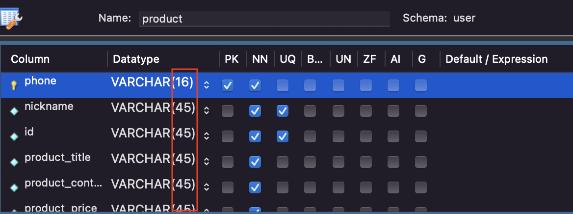 table 1에 제약조건 기본키인 id varchar(10)의 필드가 있고