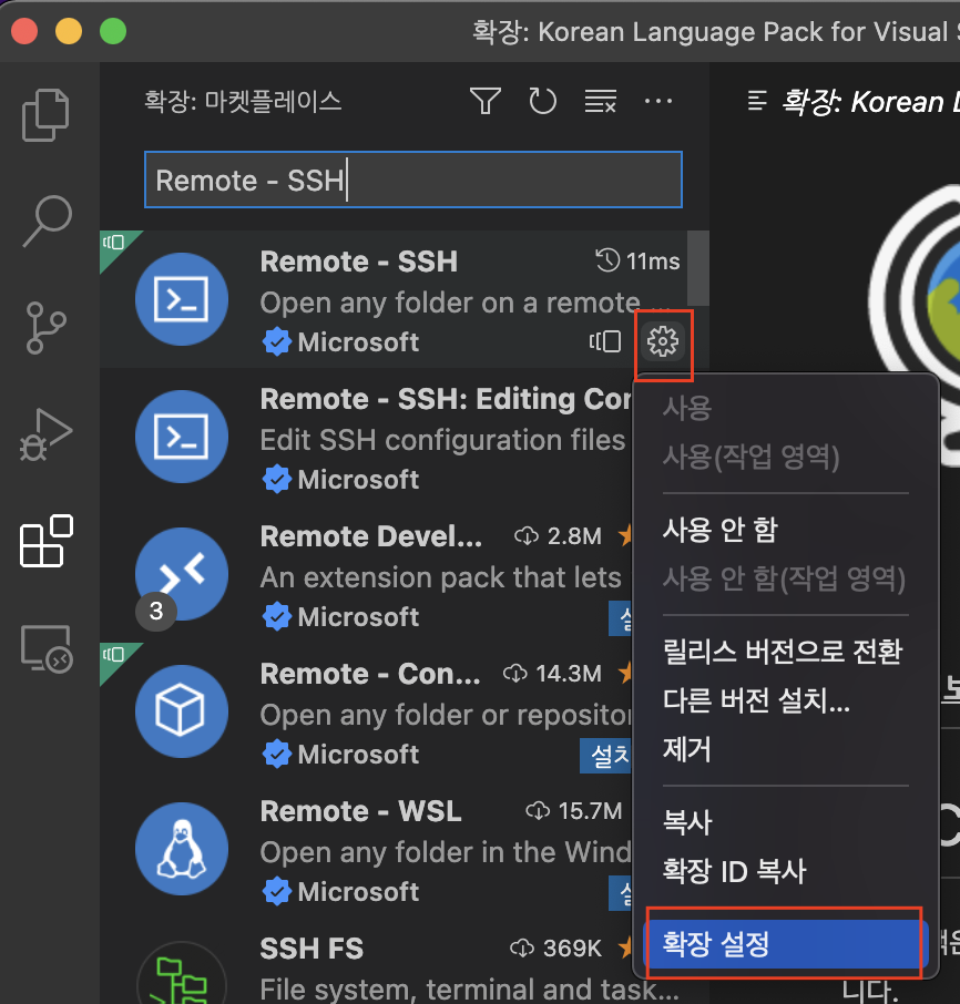 3. Remote - SSH의 톱니바퀴를 클릭 -> 확장 설정을 클릭한다.