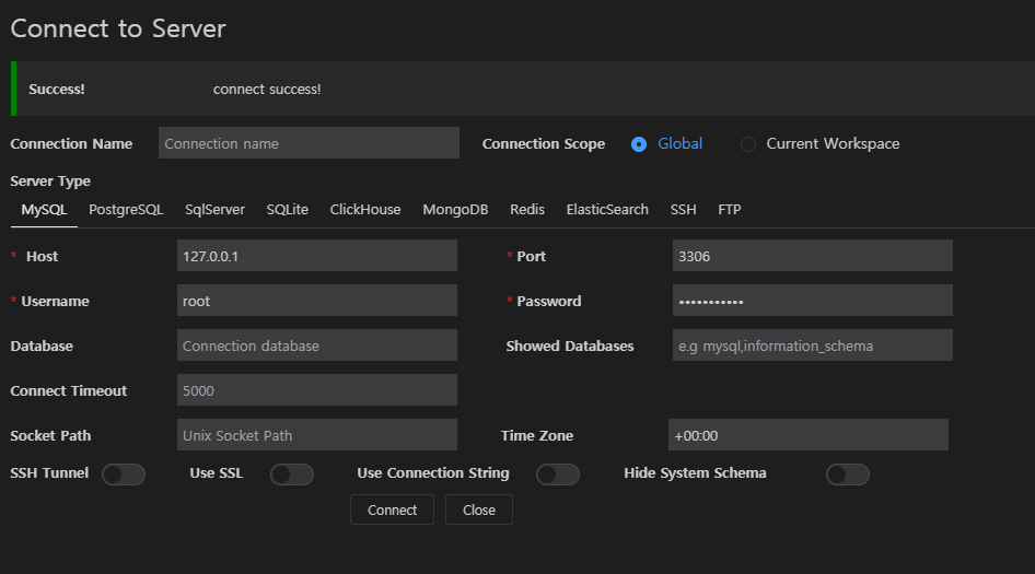 Password : 이 부분에는 MySQL에서 생성한 유저 계정을 들어갈때 입력했던 비밀번호를 입력해주면 된다.