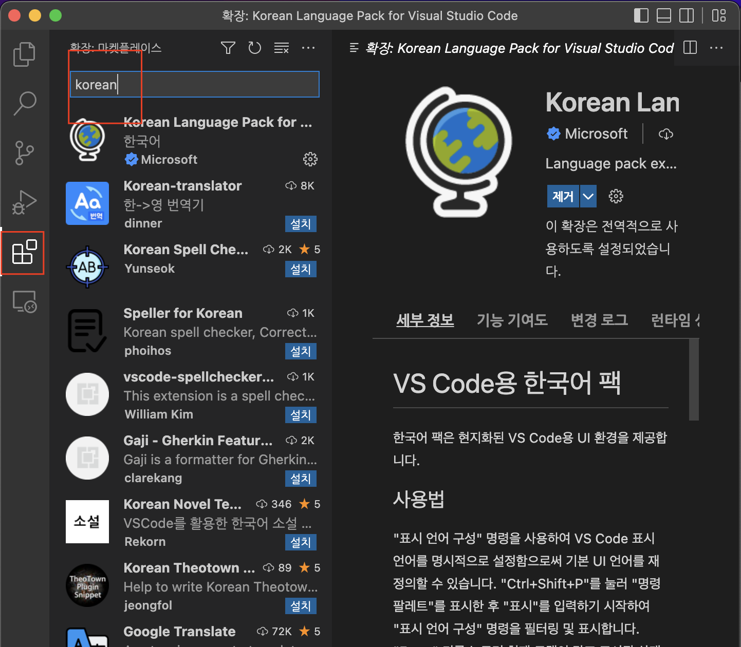 1. 한국어로 보면 쉽기 때문에 VSCode 실행 후 마켓플레이스에서 한국어 확장 기능을 깔아준다.