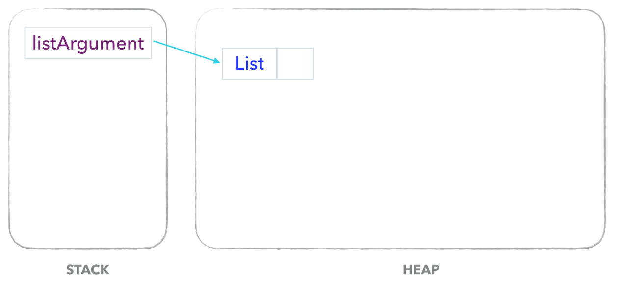 "new" 예약어를 사용하여 생성하려는 오브젝트를 저장할 수 있는 충분한 공간이 heap영역에 있는지 먼저 찾은 다음, 빈 List를 참조하는 listArgument라는 지역변수를 스택에 할당한다.