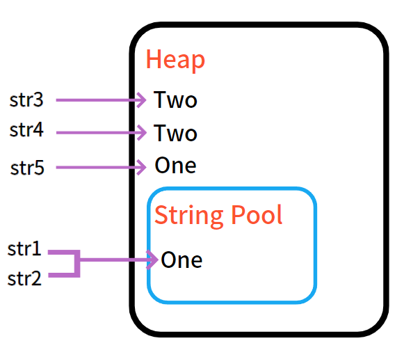 하지만 String같은 경우 "new" 예약어를 사용하지 않고 바로 값을 할당하고 만약 그 값이 같은 문자열이라면 heap영역에 그 문자열을 하나로 할당하고, Stack에서는 변수명은 다르지만 서로 같은 주소를 할당하는 레퍼런스 변수가 될 것이다.