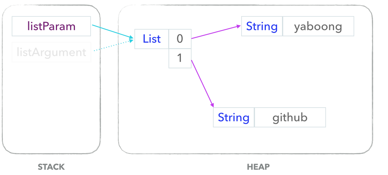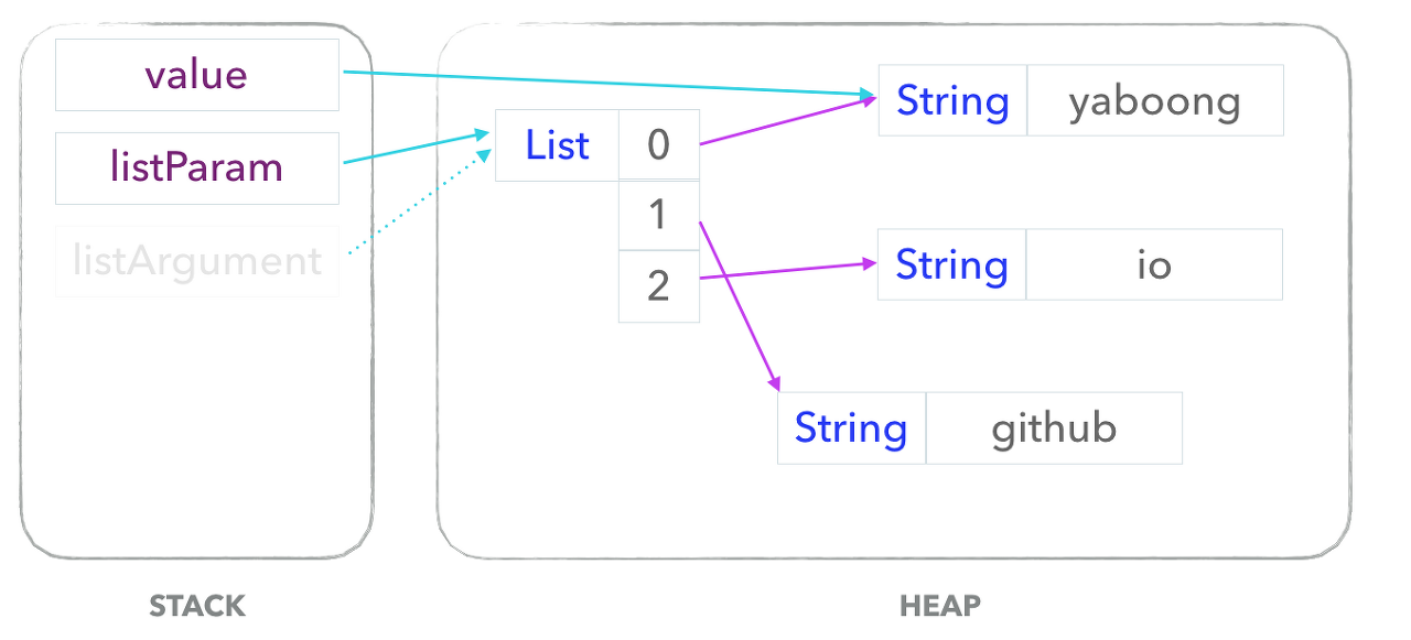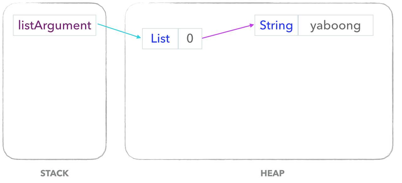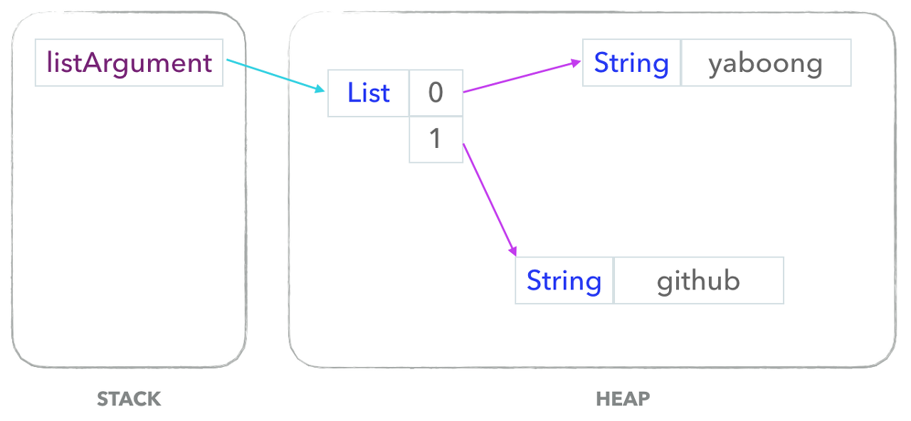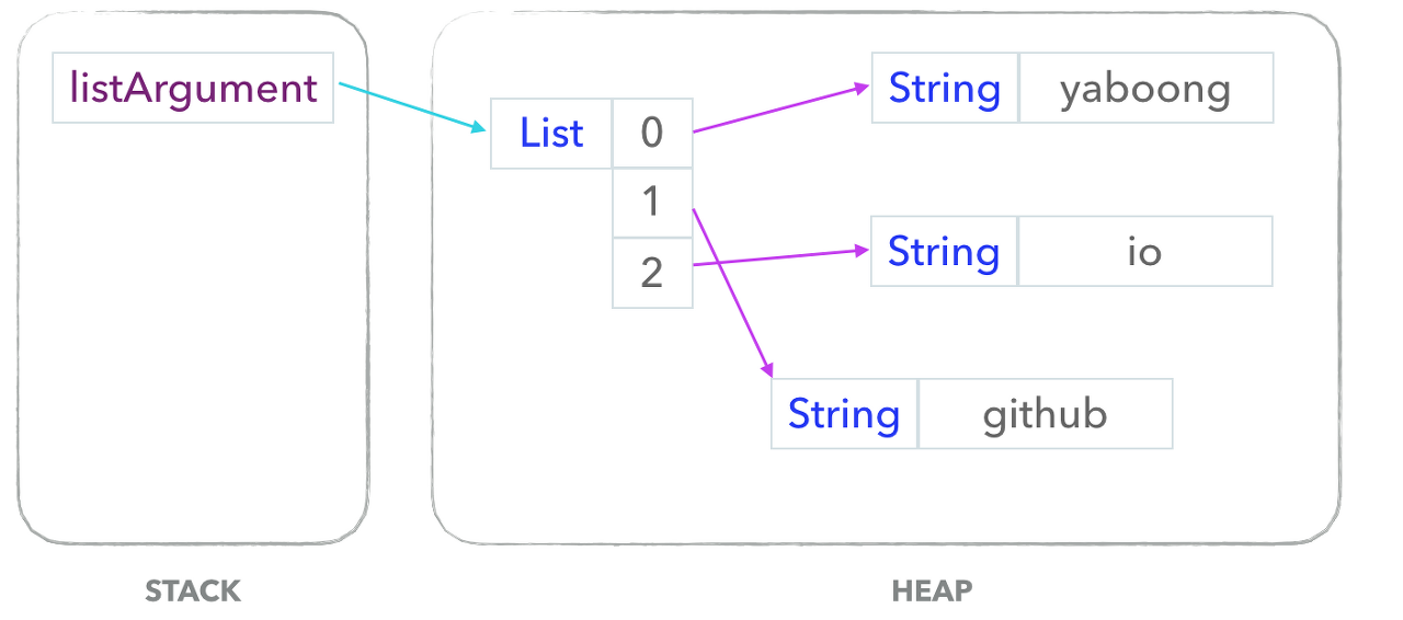 List내부의 인덱스에 의해 하나씩 add()된 데이터에 대한 레퍼런스 값을 갖게 된다. [ List의 add()를 통해 heap영역의 List내에 String 타입으로 yaboong을 저장하였고, listArgument는 heap에 저장된 List의 실제값을 참조하는 레퍼런스 변수이므로 List의 add()를 한 것 "yaboong"도 접근할 수 있다. 왜냐하면 "yaboong"이라는 String을 새로운 heap영역에 공간을 할당한 것이 아닌 List에 추가한 것이기 때문 ]