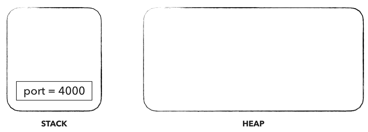 1. int port = 4000;에 의해서 기존처럼 4000 이라는 값이 port라는 변수명으로 할당되어 stack에 쌓인다.