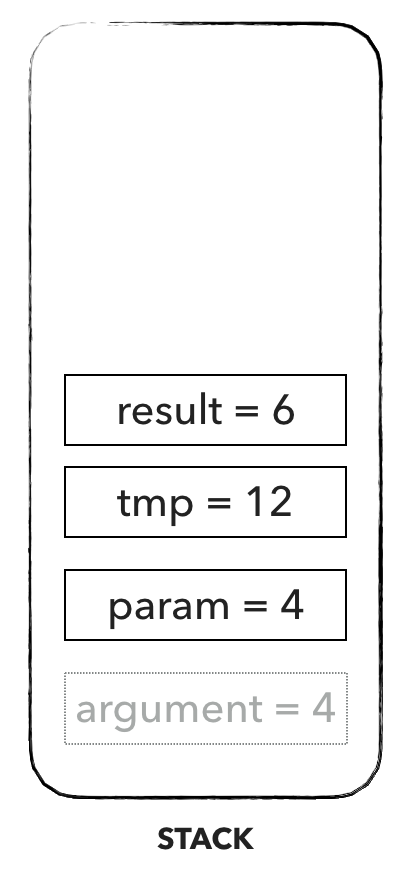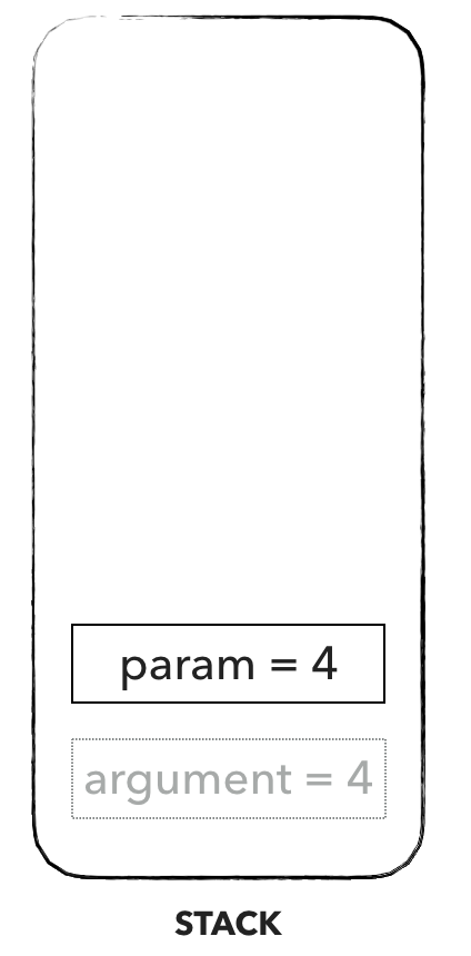 이 때 매개변수로 넘겨받은 argument는 param이라는 변수로 복사되어 전달되고, param 또한 기본자료형이므로 Stack에 할당된 공간에 값이 할당된다.