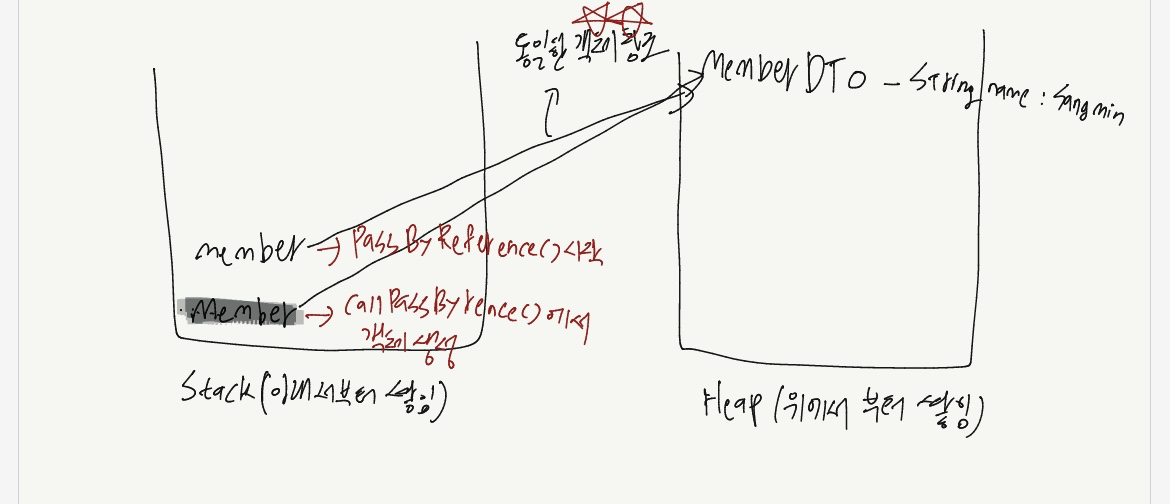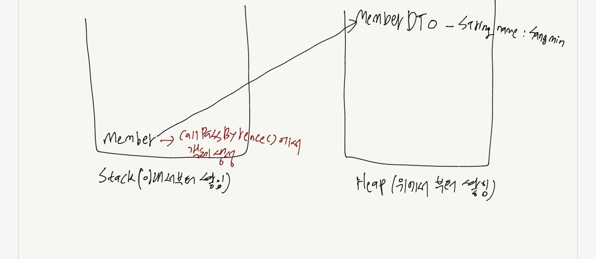 1. callpassByreference()메소드에서 객체를 생성하여 Heap영역에 값(Sangmin)과 공간이 할당되는데 stack 영역에는 member 래퍼런스가 생성되고 Heap영역에 값(Sangmin)을 가르킨다(참조)