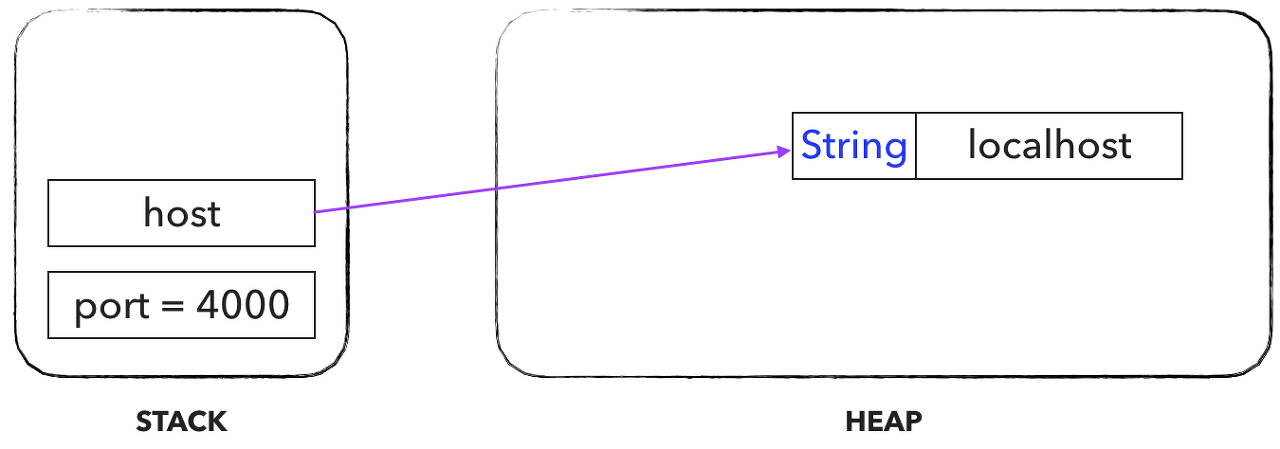2. String은 Object를 상속받아 구현되었으므로 String은 heap 영역에 할당되었고, stack에 host라는 이름으로 생성된 변수는 heap 에 있는 "localhost"라는 String을 레퍼런스(참조)하게 된다.