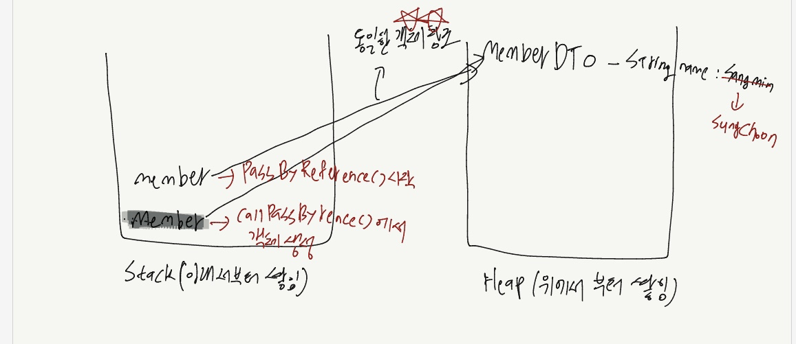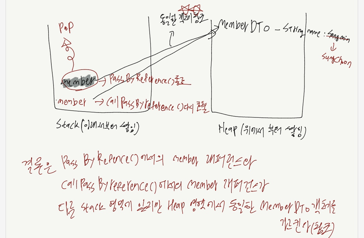 왜냐하면, PassByreference()에서의 member 래퍼런스변수와 callpassByreference()에서의 member 래퍼런스가 다른 stack 영역에 할당되었지만 참조하는 값이 같기 때문이다. 즉, Heap 영역에서 동일한 memberDTO객체를 가르키기 때문이다.