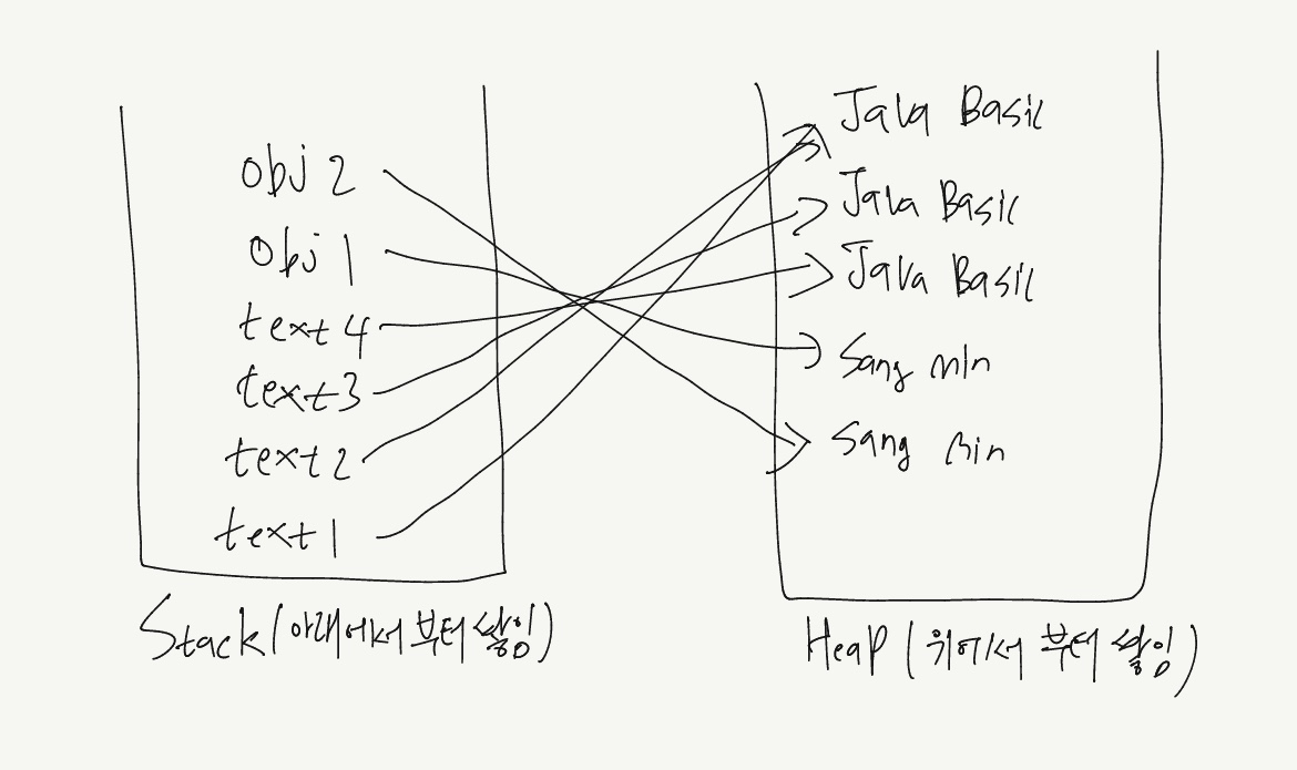 Stack영역에서는 text1의 레퍼런스 변수가 String constant pool 부분에 "Java Basic"의 값을 가르킨다. - String text2 = "Java Basic"; 의 구문을 통해 Heap영역내의 String constant pool 부분에 이미 "Java Basic"의 공간이 할당되어 있다. String constant pool영역에서 동일한 값("Java Basic")이 있기때문에 stack영역의 text2는 같은 위치에 있는 String constant pool영역의 "Java Basic" 객체를 참조한다.