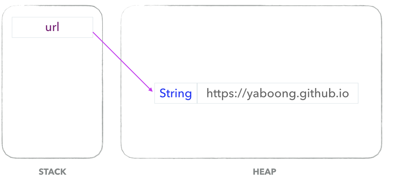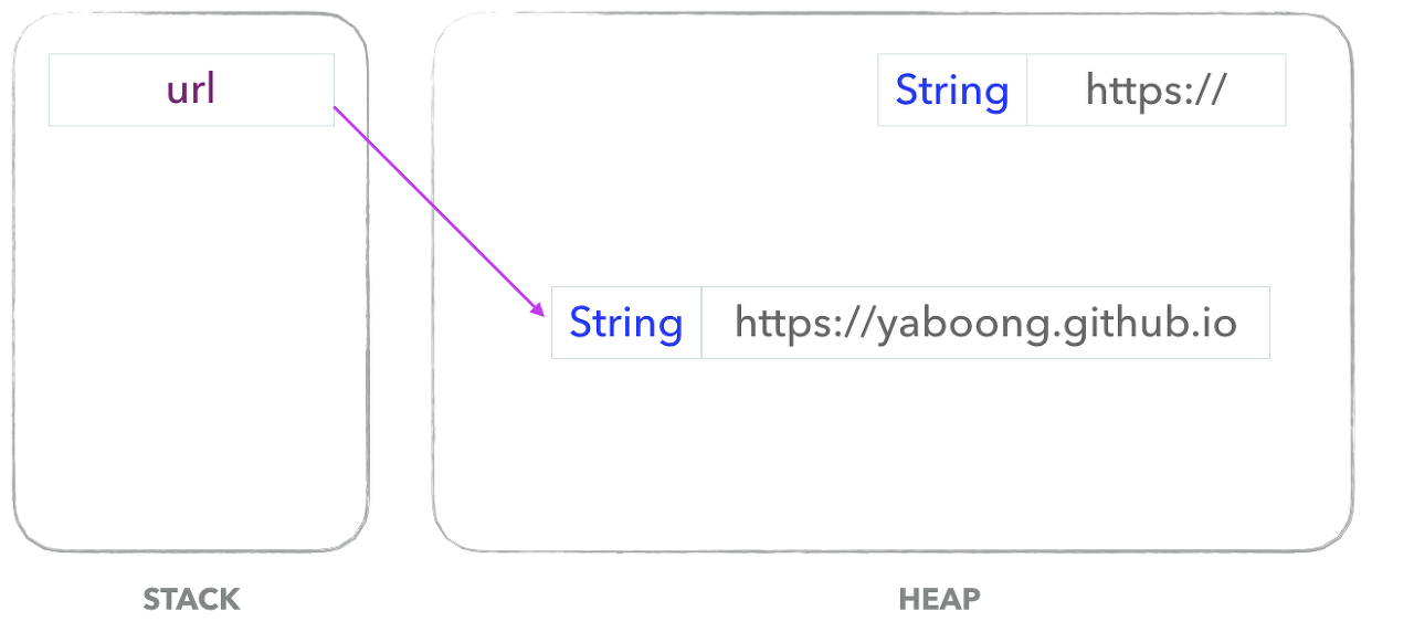 즉, "new"예약어에 의해 heap 영역에 충분한 공간이 있는지 확인한 후 "yaboong"이라는 문자열을 할당하게 된다. 이때 새롭게 생성된 문자열인 "yaboong"을 위한 변수는 stack에 할당되지 않는다.