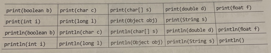 주요 메소드는 print() println() 메소드다. 이 둘의 차이는 print()는 줄바꿈을 하지 않고, println()은 줄바꿈을 한다. 또한 println()은 매개 변수가 없는 매소드가 존재한다. 공통점으로는 두 메소드 모두 기본자료형과 참조자료형을 매개변수로 사용할 수 있다.