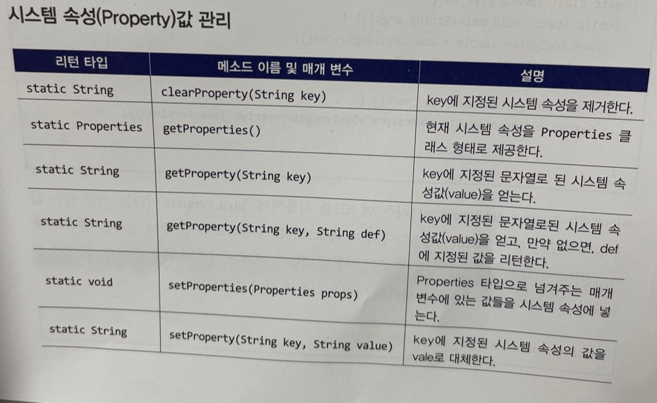 생각해보면 실제 System 클래스에 선언되어 있는 메소드들을 살펴보면 출력과 관련된 메소드들은 없다. 즉, Sytem 클래스는 이름 그대로 시스템에 대한 정보를 확인하는 클래스이다. 이 클래스에서 제공되는 메소드를 분류해보면다면 다음과 같이 다양한 역할을 한다는 것을 알수 있다.