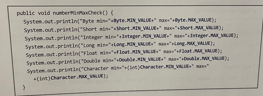 기본자료형을 참조 자료형으로 만든 클래스들은 Boolean 클래스를 제외하고 모두 MIN_VALUE와 MAX_VALUE라는 상수를 갖고 있다.