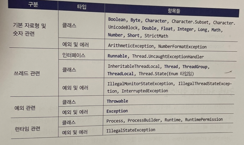 java.lang 패키지에서 제공하는 인터페이스, 클래스, 예외 클래스는 다음과 같이 분류할 수 있다.