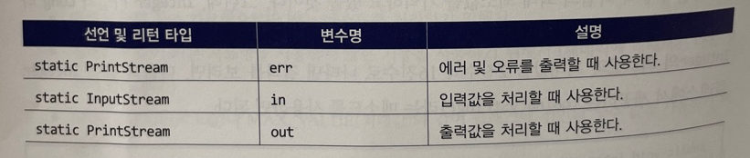 System은 클래스 이름이다. 그 다음에 있는 out은 System 클래스에 static으로 선언된 변수 이름이다. out은 위 표에서 보면 알 수 있듯이 PrintStream 타입이다.