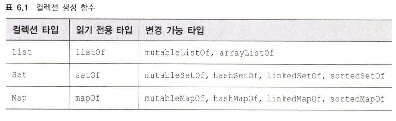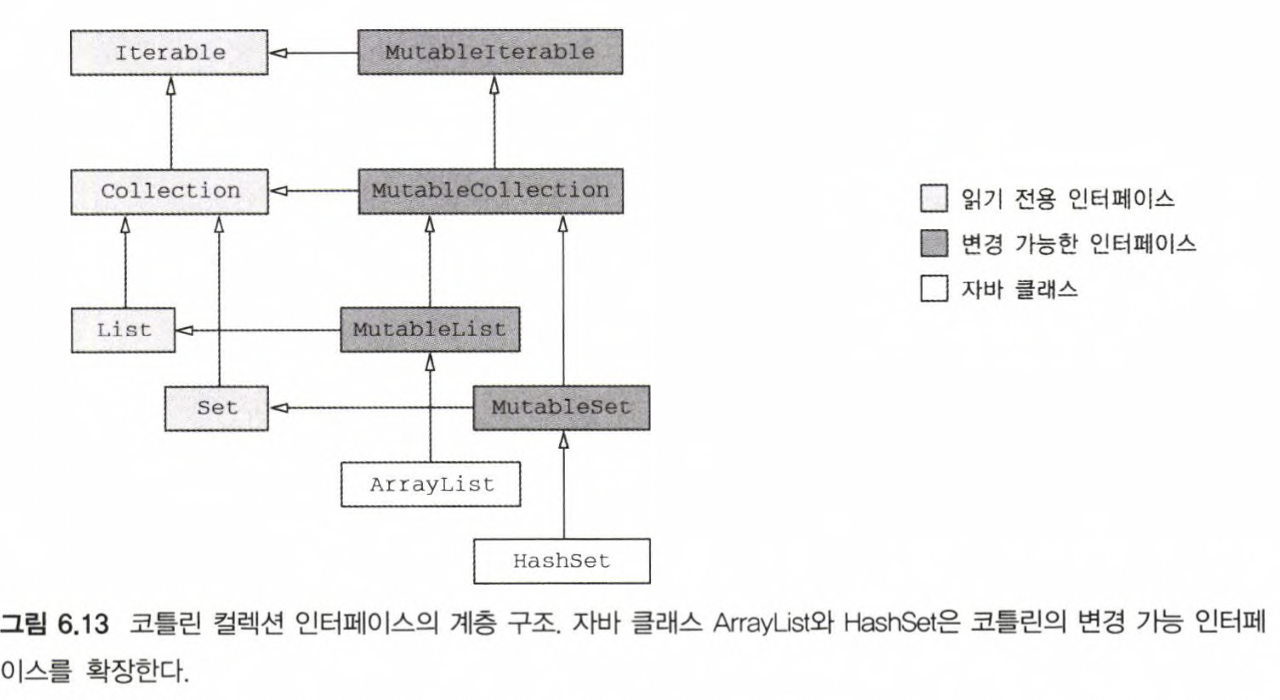 - 코틀린 컬렉션은 표준 자바 컬렉션을 사용한다. 하지만 코틀린은 자바보다 컬렉션을 더 개선해서 읽기 전용 컬렉션과 변경 가능한 컬렉션을 구별해 제공한다.