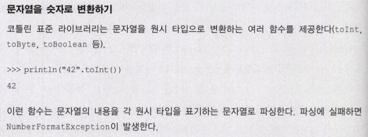 - 코틀린에서는 수를 표현하는 타입(Int 등)이 일반 클래스와 똑같이 생겻고 일반 클래스와 똑같이 동ㅈ가한다. 하지만 대부분 컴파일러는 숫자 타입을 자바 원시 타입(int 등)으로 컴파일한다.