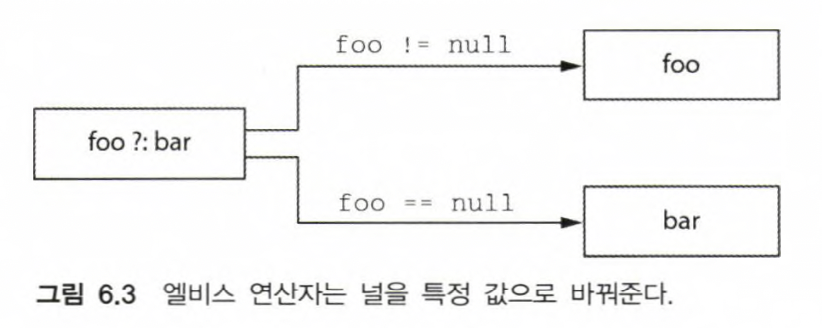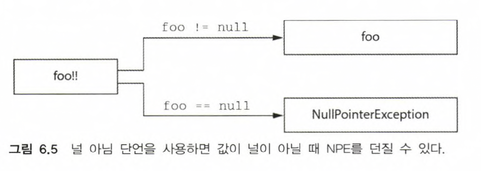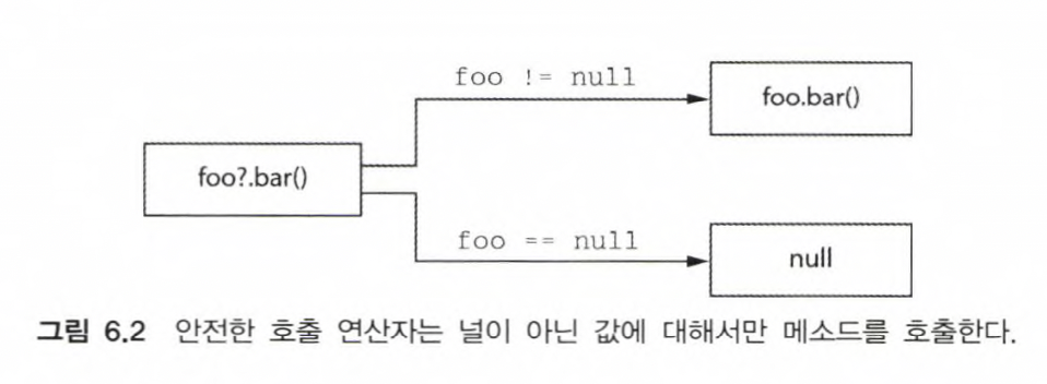 - 코틀린의 안전한 호출(?.), 엘비스 연산자(?:), 널아님 단언(!!), let 함수 등을 사용하면 널이 될 수 있는 타입을 간결한 코드로 다룰 수 있다.