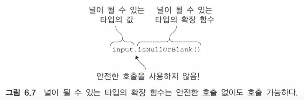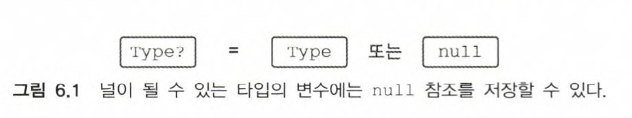 예를들어, 널이 될 수 있는 타입인 변수에 대해 변수.메소드()처럼 메소드를 직접 호출할 수는 없다.