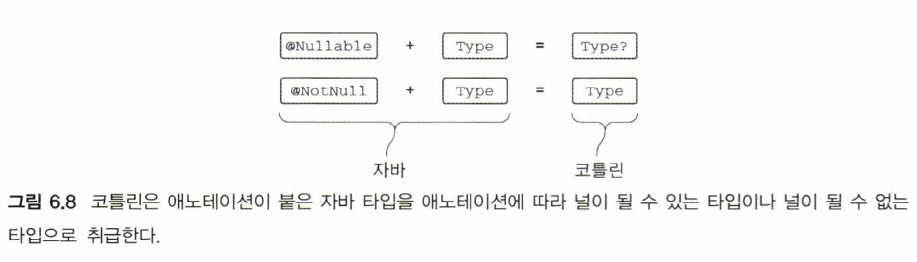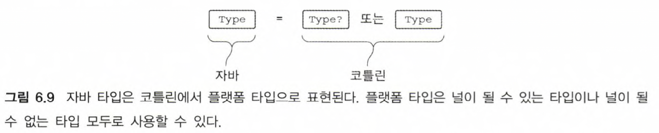 - 자바에서 가져온 타입은 코틀린에서 플랫폼 타입으로 취급된다. 개발자는 플랫폼 타입을 널이 될수 있는 타입으로도 널이 될 수 없는 타입으로도 사용할 수 있따.